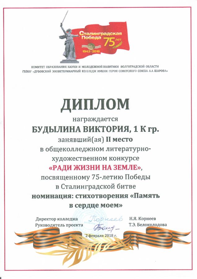 Приглашаем принять участие в проведении общеколледжного литературно-художественного конкурса "Ради жизни на Земле" студентов всех курсов Дубовского зооветеринарного колледжа», посвященной 75-летию Победы в Сталинградской битве.