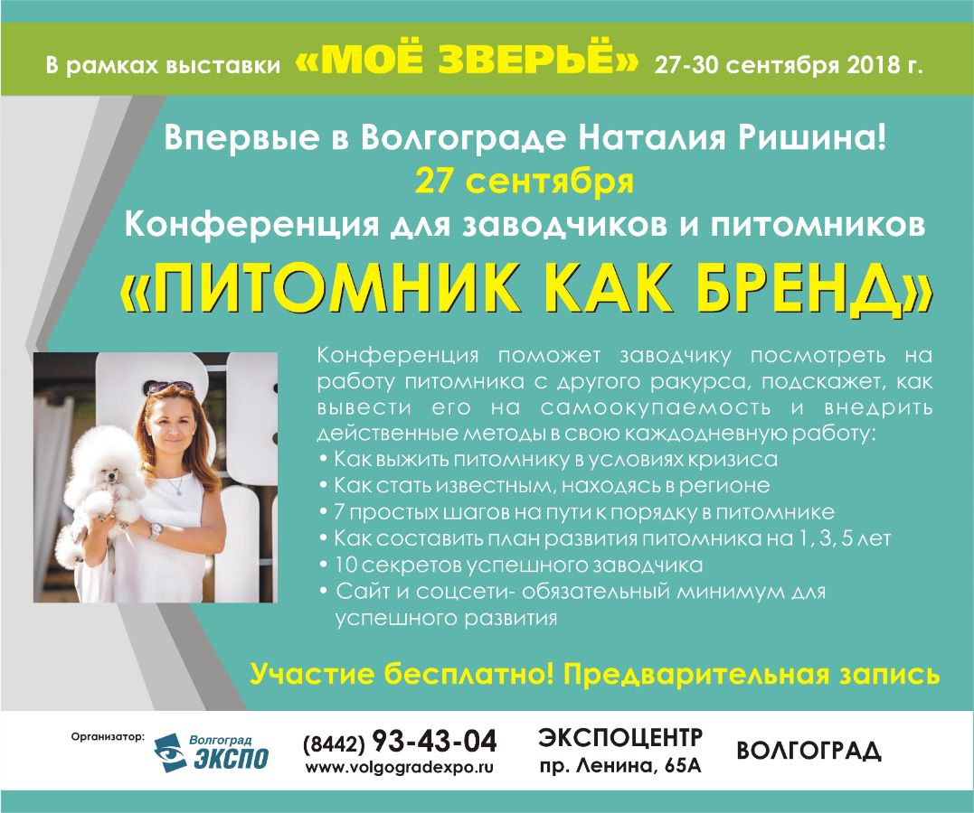 Первый и единственный раз в Волгограде конференция «Питомник как бренд» от НАТАЛИИ РИШИНОЙ, руководителя проекта «DOG-ПРОФИ», автора более 30 породных книг, организатора научно-образовательной конференции для заводчиков собак и кошек, ветеринарного врача, владельца питомника собак.Что будет: