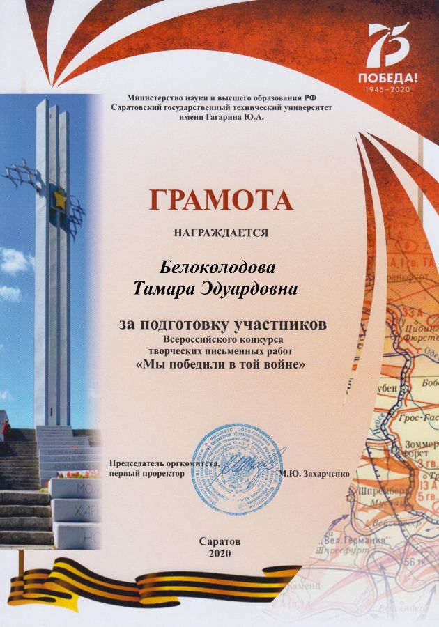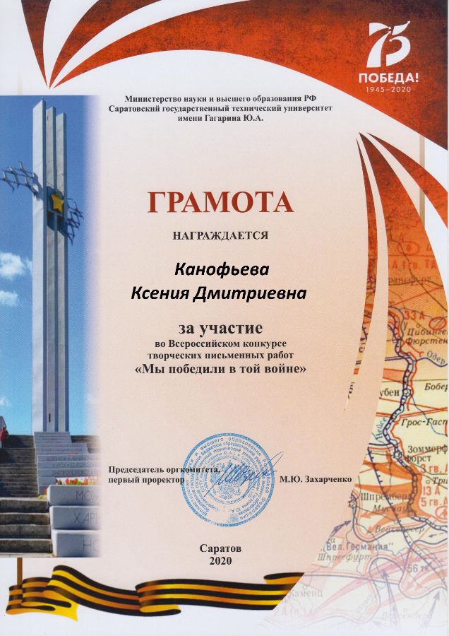 В мае наши обучающиеся дистанционно участвовали со своими сочинения во Всероссийском конкурсе письменных творческих работ «Мы победили в той войне», организованном Саратовским государственным техническим университетом имени Ю.А. Гагарина. Канофьева Ксения Дмитриевна, студентка 2 курса отделения «Ветеринария», подготовила исследование на тему «Великая Отечественная война в моей семье» о своей прабабушке. А Алиева Милана Руслановна, студентка 1 курса написала трогающее за душу эссе «Дети войны». Работы очень хорошие и интересные, вошли в финал конкурса. Всего было представлено 1800 работ из 32 регионов нашей страны. Девушки вместе с их руководителем, преподавателем Белоколодовой Т.Э., награждены грамотами ректора университета.